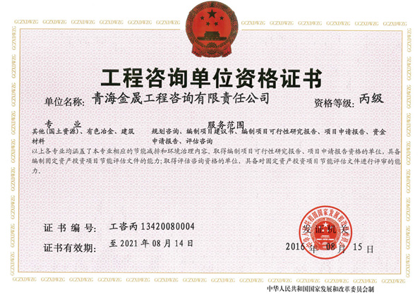 青海金晟工程咨詢有限責(zé)任公司成立于2006年1月,是國(guó)家發(fā)改委審核認(rèn)定,并取得《工程咨詢資格證書》的專業(yè)咨詢單位。公司具有獨(dú)立法人資格,主要從事礦山企業(yè)規(guī)劃咨詢、工程項(xiàng)目規(guī)劃、設(shè)計(jì)及招投標(biāo)咨詢、建設(shè)項(xiàng)目評(píng)估咨詢、工程項(xiàng)目管理、工程項(xiàng)目建議書、可行性研究報(bào)告、項(xiàng)目申請(qǐng)報(bào)告、資金申請(qǐng)報(bào)告及礦山開(kāi)發(fā)利用方案的編撰等服務(wù)。